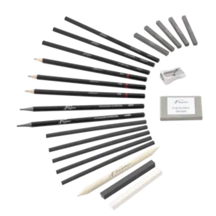 24-częściowy zestaw do rysowania i szkicowania Nassau Fine Art to niezbędna kolekcja dla artystów, ilustratorów i hobbystów, którzy chcą odkrywać świat rysowania i szkicowania. Zaprojektowany, aby zapewnić wszystko, czego potrzebują zarówno początkujący, jak i zaawansowani artyści, ten wszechstronny zestaw zawiera zrównoważony asortyment ołówków grafitowych, ołówków węglowych, narzędzi do mieszania i gumek - idealny do tworzenia szczegółowych szkiców, portretów lub ekspresyjnego cieniowania. Wysokiej jakości ołówki grafitowe zapewniają gładkie, spójne linie, podczas gdy ołówki i sztyfty węglowe oferują bogate, głębokie odcienie dla uzyskania dramatycznych efektów. Dołączona gumka do ścierania pozwala na precyzyjne rozjaśnianie i mieszanie, a papierowy kikut pomaga tworzyć miękkie przejścia i tekstury. Prezentowany w eleganckim, uporządkowanym pudełku zestaw jest idealny do szkoły, studia lub podróży. Niezależnie od tego, czy szkicujesz krajobrazy, postacie, czy eksperymentujesz ze studiami tonalnymi, zestaw Nassau Fine Art Drawing Set zapewnia wszystkie niezbędne elementy, aby ożywić swoje kreatywne pomysły.