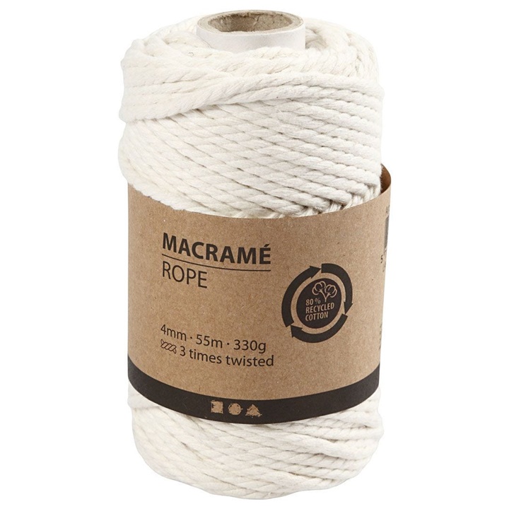 Sznurek złożony z trzech warstwy przędzy idealnie nadaje się do tworzenia techniką makramy. Sznurek, ma nawój 55 metrów o grubości 4 milimetrów, który możesz wykorzystać przy tworzeniu łapaczy snów, biżuterii czy dekoracji wnętrz. Sznurek składa się w 80% z bawełny pochodzącej z recyklingu i w 20% z poliestru.