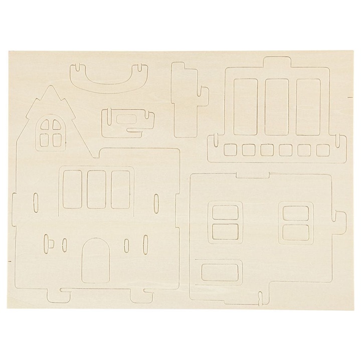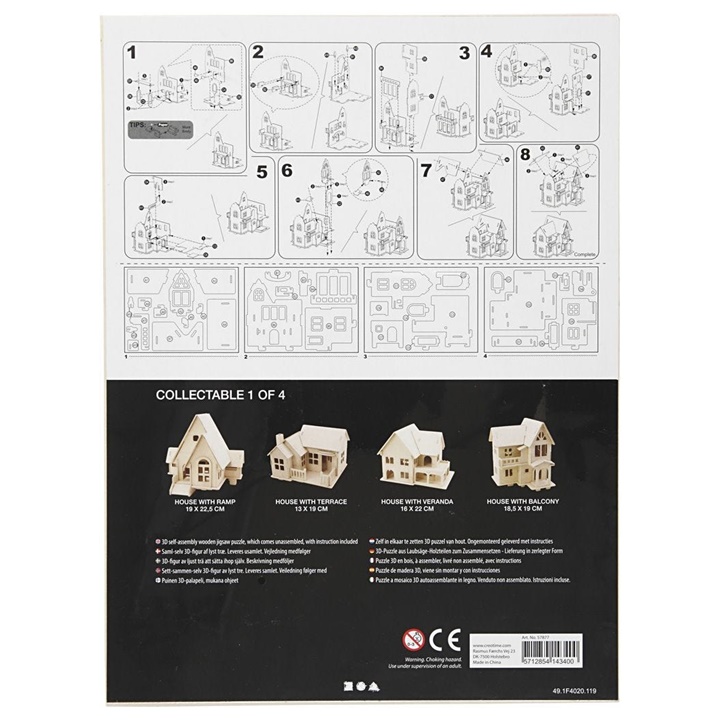 Zestaw 3D domku z balkonem zapewni Ci zabawę dla całej rodziny. Stwórz swój własny mini dom, który następnie możesz skompletować i udekorować według własnych pomysłów. Dwupiętrowy domek z balkonem to nie tylko ciekawa dekoracja do składania, ale może następnie służyć do zabawy jako domek dla lalek. Lekka sklejka jest odpowiednim materiałem do dalszej obróbki, dzięki czemu można pomalować dom, przykleić na nim dekoracje, a także zastosować technikę: decoupage, itp.