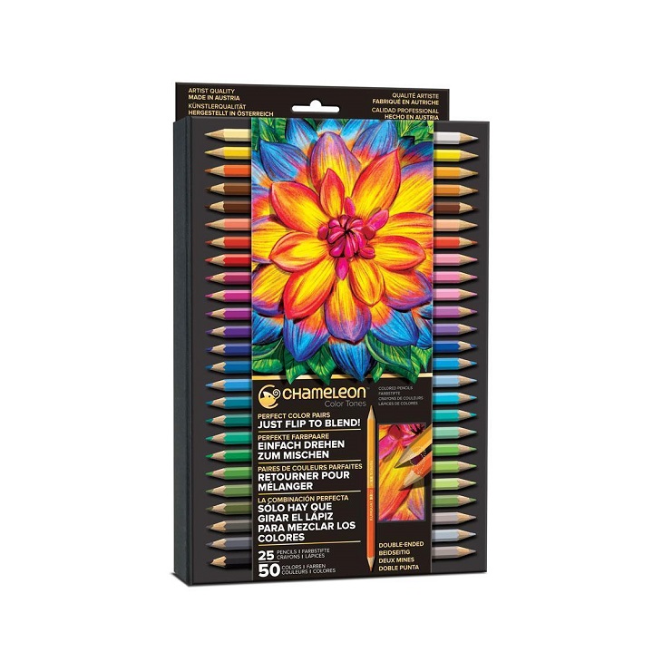Kredki ołówkowe Chameleon to dwustronne kredki, czyli dwa uzupełniające się kolory w jednej kredce zaprojektowane tak, aby idealnie się ze sobą łączyły. Są to artystyczne, profesjonalne kredki ręcznie wytwarzane w Austrii. Dzięki zawartości dużej ilości pigmentu ich kolory są intensywne, konsystencja jest miękka i gładka dzięki czemu kolory łącza się ze sobą z niebywałą łatwością.