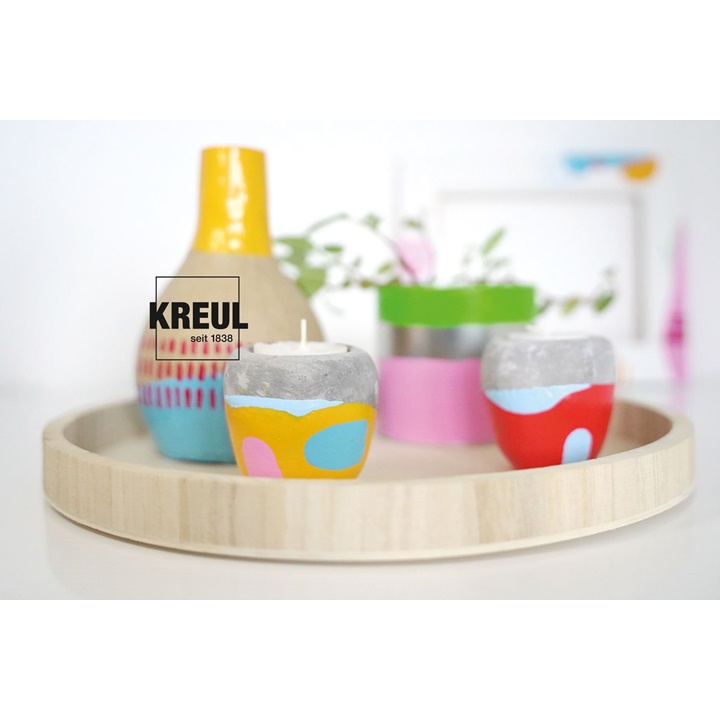 Zestaw błyszczących farb akrylowych Color Living marki KREUL wniesie blask do wnętrza domu. Zawiera sześć kolorów dopasowanych do siebie w idealnej harmonii. Niezależnie od tego, czy chodzi o świeczniki, czy meble, współczesne połączenie chłodnych i ciepłych kolorów może rozjaśnić nawet szare i pochmurne dni. Dekoracje domowe mogą z łatwością nabrać nowego, promiennego wyglądu. Farby akrylowe są nie tylko wysoce kryjące, ale także szybko schną i tworzą piękne błyszczące wykończenie. Są odporne na wodę i warunki atmosferyczne. Niezbędne do odważnych i wyrazistych projektów DIY! Nadają się do malowania drewna, papieru, kartonu, kamienia, suszonego betonu, terakoty, szkła, ceramiki, gliny, metalu, plastiku, samoutwardzalnej modeliny. Idealny do prac dekoracyjnych i jako podkład pod Photo Transfer Potch i decoupage. Nadaje się również do technik malarskich, takich jak zanurzanie, nakładanie szpachelką i natryskiwanie. Kolory mogą być lakierowane po wyschnięciu. Farby są produkowane w uczciwym i bezpiecznym procesie w Niemczech. Opakowanie zestawu wykonane jest z kartonu wykonanego w 94% z materiałów pochodzących z recyklingu.